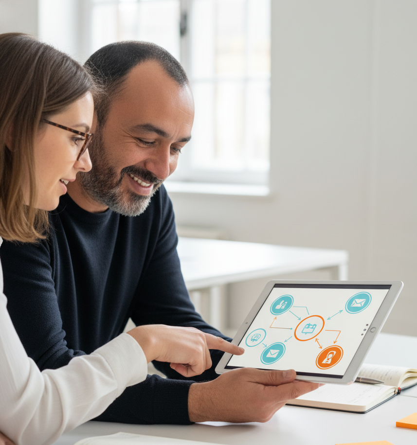 Implementamos procesos, automatizaciones simples y plantillas que te liberan tiempo sin perder humanidad.
